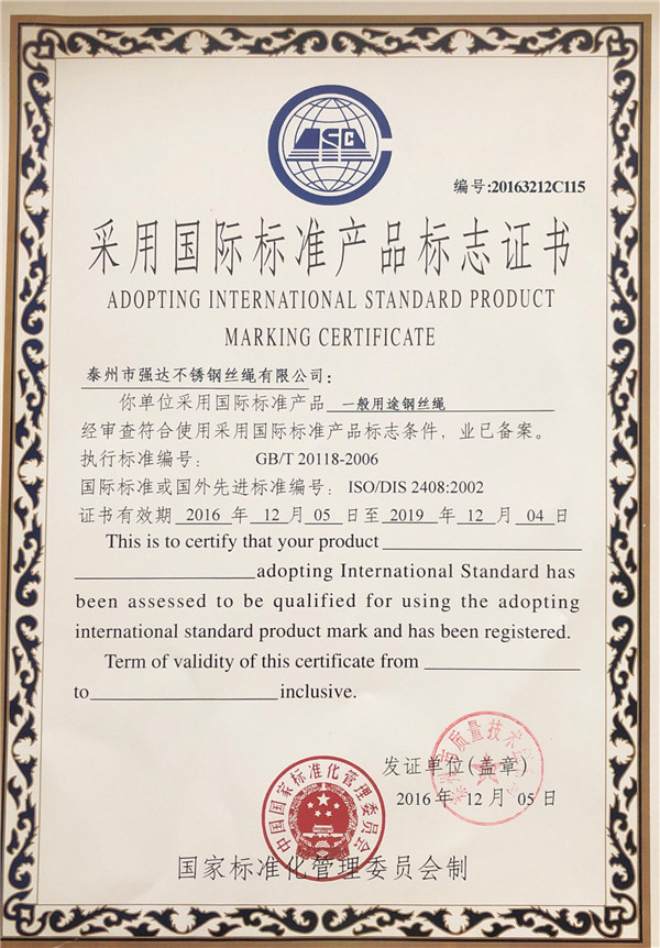 泰州市強(qiáng)達(dá)不銹鋼絲繩有限公司位于江蘇興化市戴南經(jīng)濟(jì)開發(fā)區(qū),公司致力于不銹鋼絲繩產(chǎn)品生產(chǎn),立志成為“國內(nèi)技術(shù)標(biāo)桿型吊索具生產(chǎn)企業(yè)”。以此戰(zhàn)略思想指導(dǎo),公司堅(jiān)決貫徹“質(zhì)量贏市場,管理增效益,誠信贏天下”的質(zhì)量方針。以完善的服務(wù)在國內(nèi)不銹鋼絲繩市場樹立良好的品牌形象。公司榮獲“江蘇省質(zhì)量信得過企業(yè)。 靈活的管理機(jī)制,經(jīng)驗(yàn)豐富的